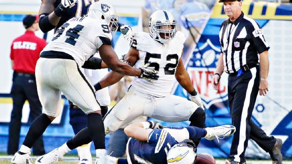 ALAMEDA -- Los ojos de Khalil Mack se angostaron mientras se acomodaba en su posición de dos puntos a principios de septiembre. Al otro lado del apoyador externo de los Oakland Raiders se encontraba el tackle izquierdo de Pro Bowl de los Houston Texans, Duane Brown, un bloqueador gigante de 6 pies con 4 pulgadas de estatura y 320 libras ansioso por poner a prueba a un jugador de primer año en lo que rápidamente se estaba convirtiendo en una paliza de Houston. Pero tan pronto como Brown disparó desde la línea de golpeo al momento del centro, Mack de 6 pies con 3 pulgadas y 252 libras habilidosamente esquivó al liniero ofensivo, tacleando con facilidad al corredor Alfred Blue de los Texans para una ganancia nula.